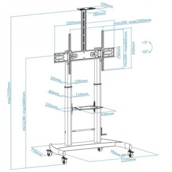 TOOQ SOPORTE DE SUELO CON RUEDAS CON REGULACIÓN DE ALTURA PARA PANTALLAS 60"-100", PES. MAX. 100 KG, VESA: MAX 1000x600 MIN 400x400 INCLINACIÓN: +5°/-10° (FS20404HM-B)