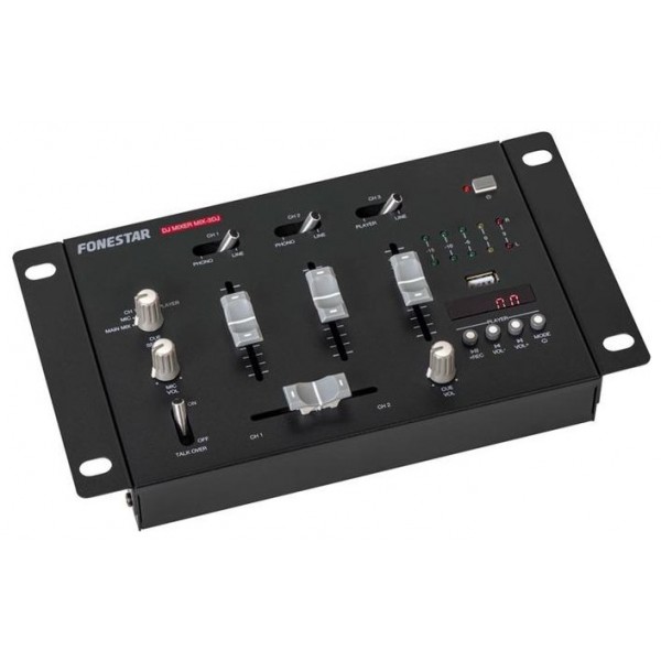 mezclador dj compacto de 3 canales estéreo y 1 micrófono.