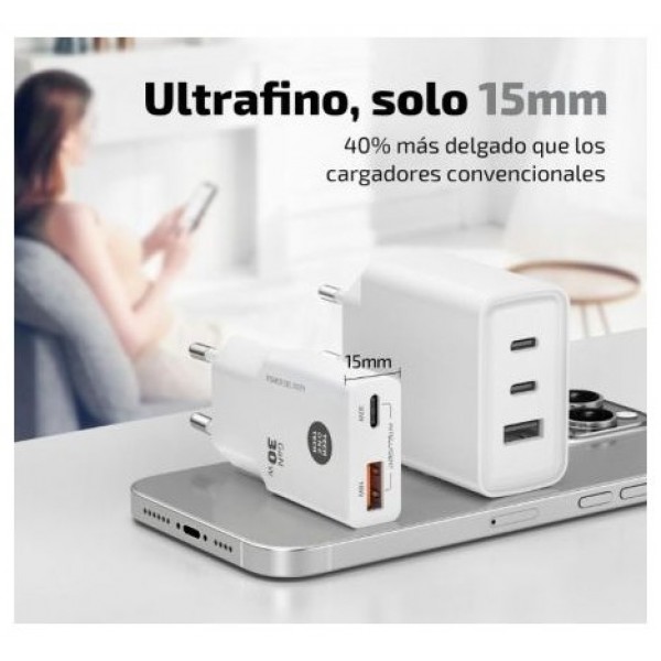 Cargador ultrarrápido GaN Power Delivery 3.0 (PD) 30W, color blanco. Carga hasta un 400% más rápido que un cargador estándar de 5W. Compatible con dispositivos anteriores. 2 Conectores: tipo USB-C de 3A + Conector USB-A. Este cargador permite cargar dispositivos como tabletas, móviles, consolas, baterías, auriculares, etc.